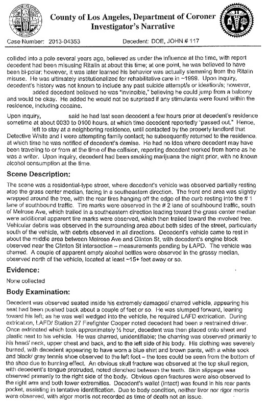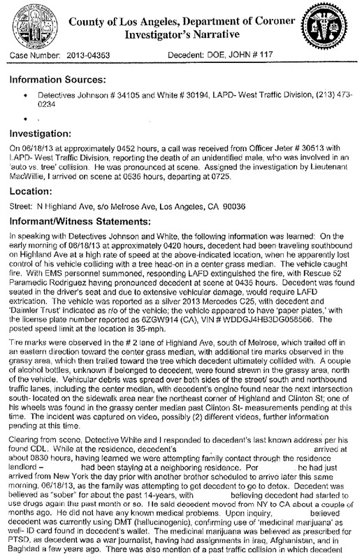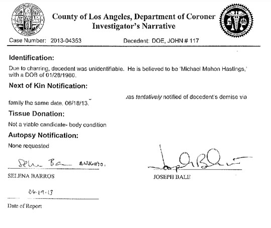 The police report contains input from a detective, doctors and toxicologists. The LAPD detective's input into Hastings' death is skimpy. There's a description of the accident scene and a short report consisting only of information gathered from an interview with one person: Michael Hastings' brother. There is an autopsy/medical report that concludes Hastings' died of "traumatic injuries" and not from burns or smoke. There is a toxicology report that indicates there was no alcohol, cocaine, DMT or barbiturates in his blood. They medical examiner did, however, say:
