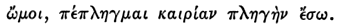 The epigraph is taken from the Aeschylus play Agamemnon. The words are spoken by Agamemnon as he is fatally stabbed by his wife Clytemnestra. Williamson translates it as, "Aye me, I am smitten with a mortal blow!" |